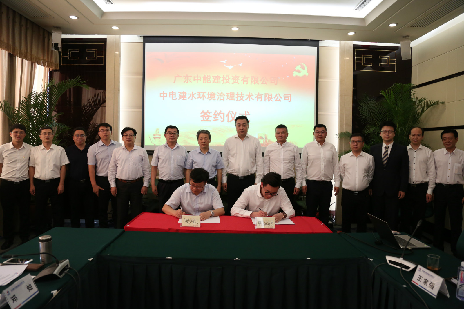 中電建水環境治理技術有限公司副董事長、總經理、黨委副書記鄭久存,黨委書記、副總經理、水環境產業園領導小組組長孔德安;中能建基金公司副總裁陳克生,中能建香港資本有限公司總裁助理王潛,廣東中能建投資有限公司投資總監任偉,中能建投資管理有限公司副總經理陳繼偉,中能建云南投資有限公司總經理吳建國等共同出席簽約儀式。
