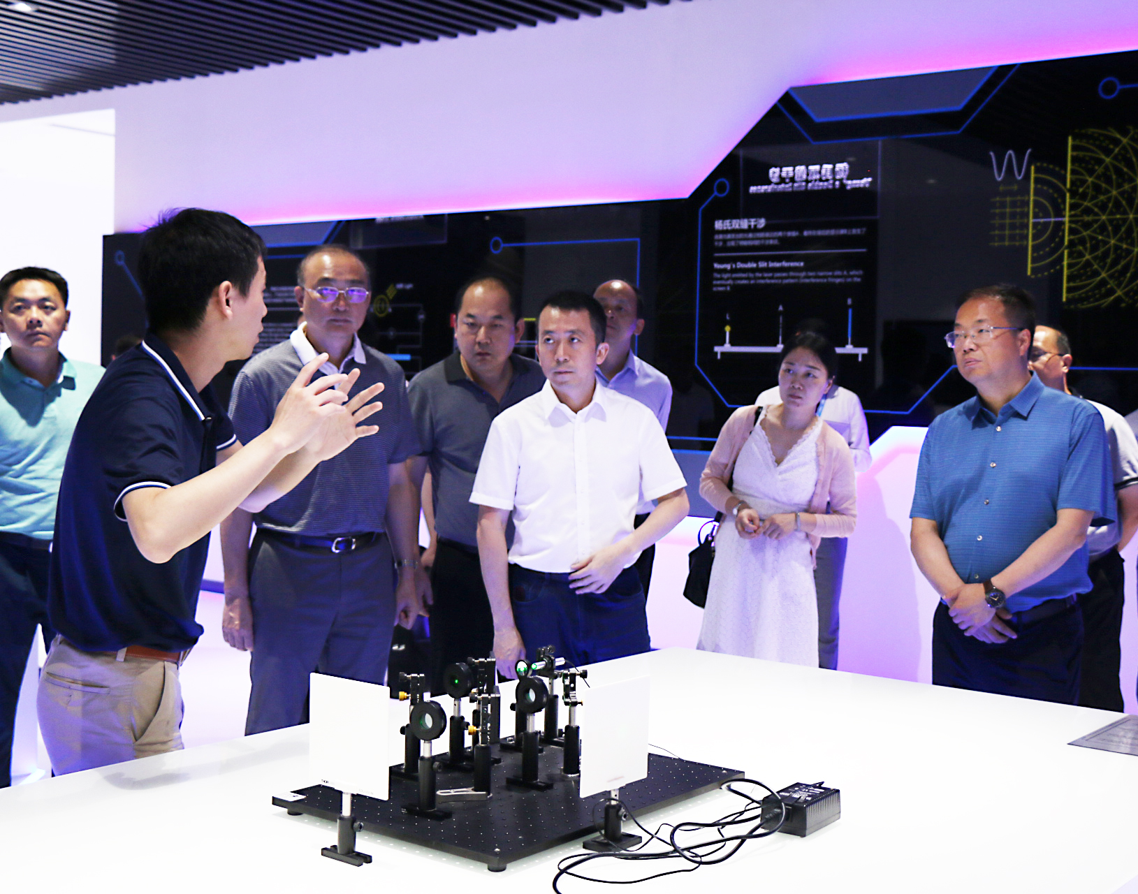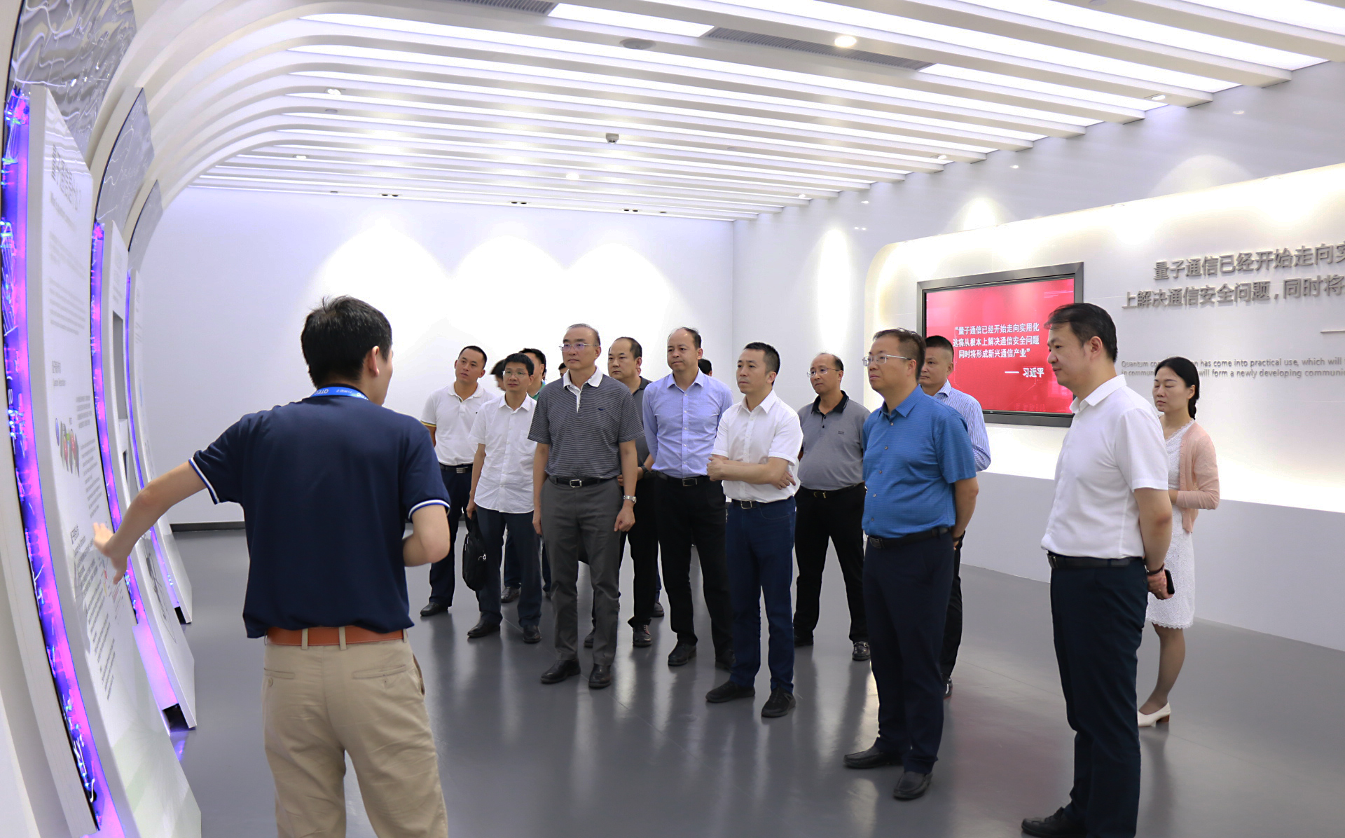 趙軍明、江智濤一行首先參觀了量子科技展示中心,聽取量子產業園相關負責人介紹量子通信的相關原理、量子加密技術的應用場景以及面向政務、國防、金融、能源、企業、家庭及個人等安全解決方案,并在現場觀看了量子加密對抗網絡入侵、量子加密視頻通話、智能安全門鎖等演示。趙軍明、江智濤等詳細詢問并了解量子通信網絡建設及應用的相關情況。