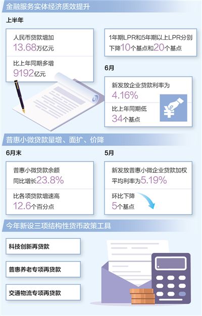 數據顯示,上半年,我國社會融資規模增量為21萬億元,同比多增3.2萬億元,人民幣貸款增加13.68萬億元,比上年同期多增9192億元。與此同時,央行持續釋放貸款市場報價利率(LPR)改革潛力,1年期LPR和5年期以上LPR分別下降10個基點和20個基點,6月份新發放企業貸款利率為4.16%,比上年同期低34個基點,企業綜合融資成本穩中有降,金融服務實體經濟的質量和效率明顯提升。